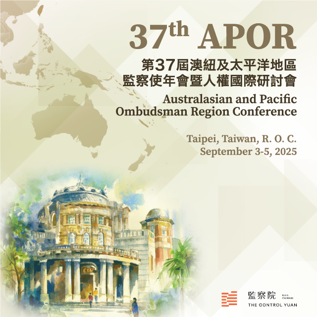 The Control Yuan will host the 37th APOR Conference in Taipei from September 3 to 5, 2025. We sincerely welcome ombudspersons from Australia, New Zealand, and the Pacific region; observers from neighboring countries; as well as distinguished experts and academics in the ombudsman and human rights fields from both home and abroad to participate in the APOR Conference. We look forward to meaningful exchanges and the sharing of valuable insights.